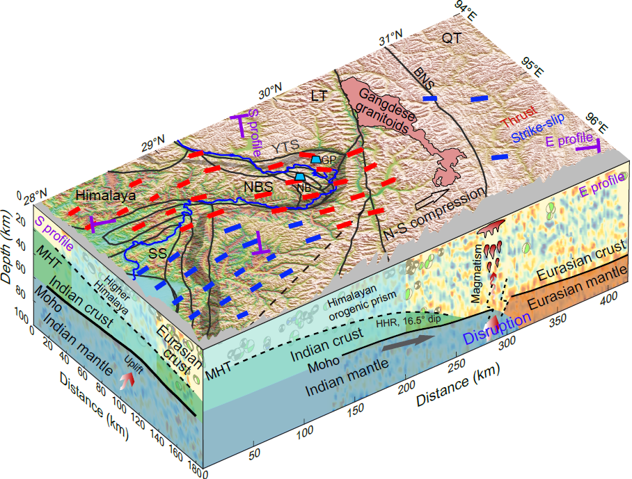 喜马拉雅山脉是地球上典型的活动碰撞造山带,为阐明该造山带的演化过程,学者们提出了多种模型,其中俯冲印度板块的几何形态被视为约束这些模型的重要因素。自20世纪80年代起,位于喜马拉雅造山带中部的主喜马拉雅逆冲断裂结构被认为是引发逆冲型大地震及喜马拉雅山脉隆升的关键构造,而喜马拉雅东部尚未明确识别到类似中部的大型逆冲结构。