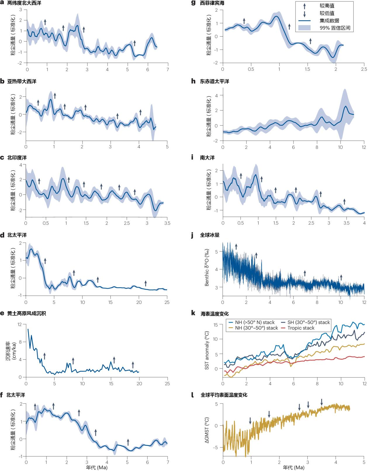 图1 晚新生代主要大洋盆地粉尘通量变化与全球温度和冰量变化的联系。a |北大西洋高纬度区粉尘通量变化(标准化值)。b |副热带大西洋区粉尘通量。c |北印度洋(阿拉伯海)。d-e |早中新世以来北太平洋粉尘通量与中国黄土高原粉尘沉积速率对比。f |晚上新世以来冰室气候条件下北太平洋粉尘通量的持续增加。g |西菲律宾海。h |东赤道太平洋。i |南大洋。j |全球冰量变化。k |晚新生代以来全球海表温度变化。l |全球平均表面温度变化。粉尘通量经卡尔曼滤波方法进行了标准化,阴影区域为99%置信区间。箭头指示粉尘通量上升期与温度下降期。主要大洋盆地粉尘通量晚新生代以来的阶段性增加与全球变冷具有显著同步性。