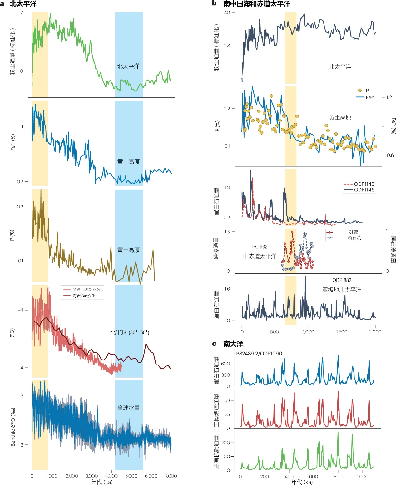 图2 北太平洋与南大洋地质历史时期粉尘通量、海洋生产力及碳循环变化的联系。a |过去700万年以来北太平洋粉尘通量(标准化值)、Fe2+和磷(<5 μm组分)元素含量与全球温度和冰量变化的联系。黄色阴影代表中更新世以来亚洲粉尘营养元素含量显著增加期,蓝色阴影代表早上新世温暖期亚洲源区粉尘通量及关键营养元素含量呈极低值。b |中更新世90-80万年以来亚洲粉尘Fe2+和磷元素含量增加对南中国海生产力和赤道太平洋浮游植物种群结构变化的影响。c |过去110万年期间南大洋粉尘铁输入通量、海洋生产力指标及总有机碳通量。