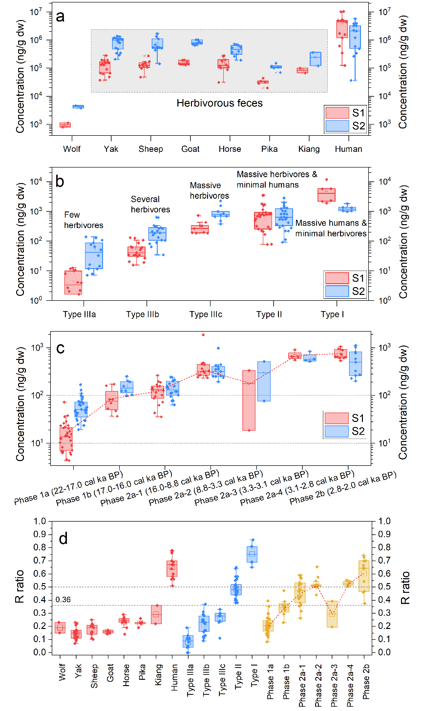 图1 青藏高原上粪便甾醇在人与不同动物粪便、湖泊表层沉积物和昂仁金湖芯中的变化。(a)草食动物(牦牛、绵羊、山羊、马和鼠兔)、食肉动物(狼)和人类粪便中S1和S2的变化;(b)青藏高原湖泊表层沉积物S1和S2在少量食草动物、中等数量食草动物、较多食草动物、较多食草动物和少量人类、较多人类和少量食草动物5种不同生态组合下的变化特征;(c)基于昂仁金湖泊岩芯S1、S2和R值在22-2 cal ka BP不同生态演化阶段;(d)R值在人与动物粪便、湖泊表层沉积物和昂仁金湖芯不同深度的分布。