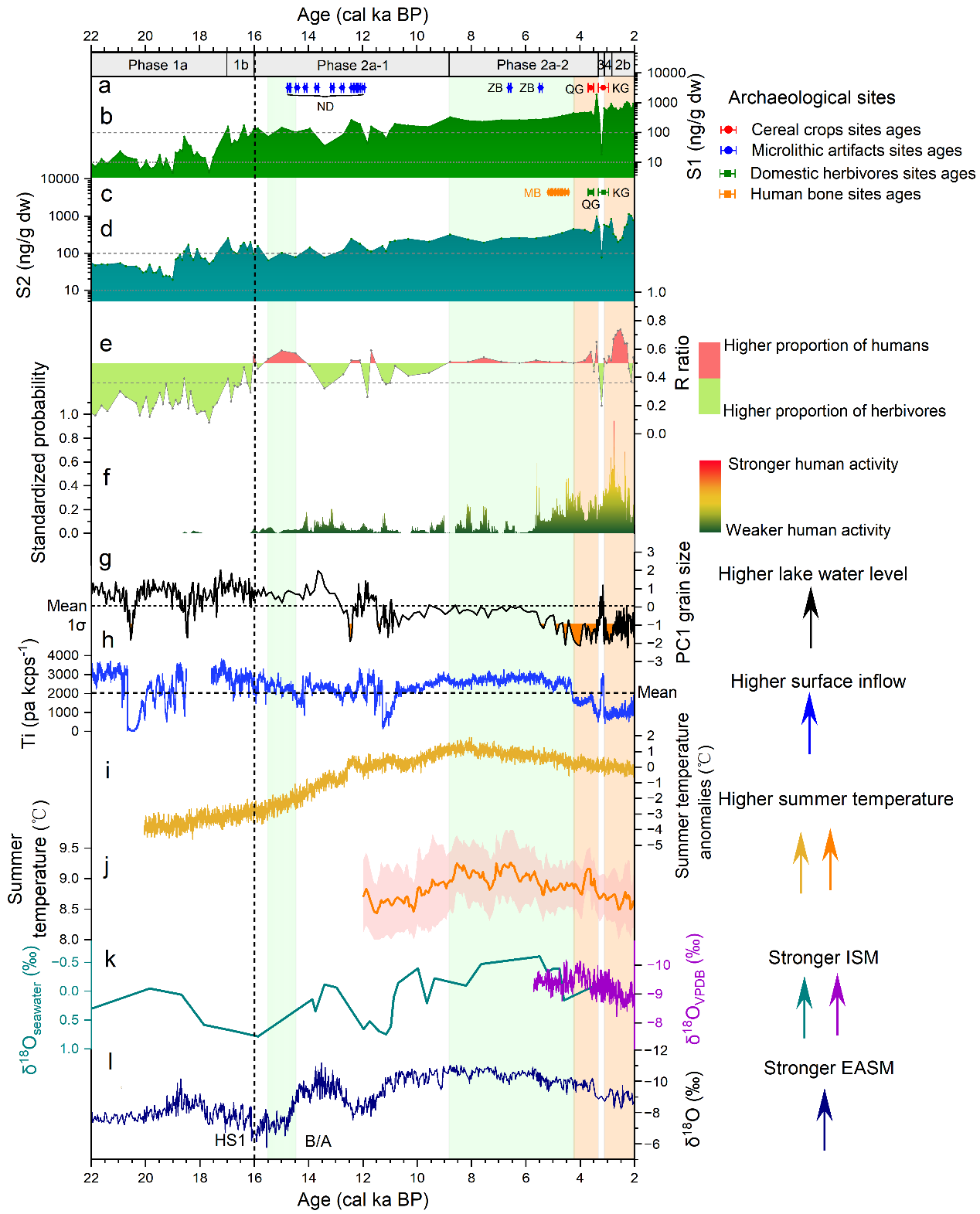 图2 青藏高原昂仁金错地区史前人类活动与古气候环境记录之间的比较。(a)青藏高原中部和南部高海拔地区谷物作物和微型石器遗址的年代分布;(b)昂仁金湖芯的 S1(粪甾醇+外侧粪甾醇)浓度变化;(c)青藏高原南部高海拔地区家畜和人类骨骼遗址的年代分布;(d)昂仁金湖芯中的 S2(5β-乙基粪甾醇+5β-乙基外侧粪甾醇)浓度变化;(e)昂仁金湖芯中人类与大型食草动物比例的变化(R值大于0.5可能表明有人类粪便的输入);(f)通过考古标准化的 14C 概率曲线表示的青藏高原人类活动强度;(g)粒度 PC1 反映的湖泊水位;(h)Ti元素反映的昂仁金错流域地表径流;(i)青藏高原夏季模拟温度异常;(j)基于花粉记录的热带太平洋地区夏季气温;(k)孟加拉湾的印度夏季季风记录和来自萨希亚洞穴的石笋记录;(l)来自多个洞穴的东亚季风记录。