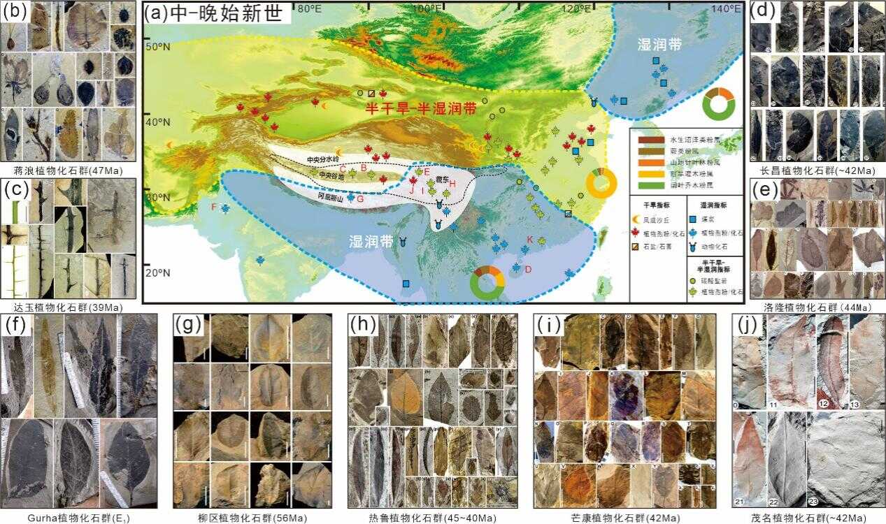 图5 中-晚始新世青藏高原及邻区典型气候和植被指标分布图