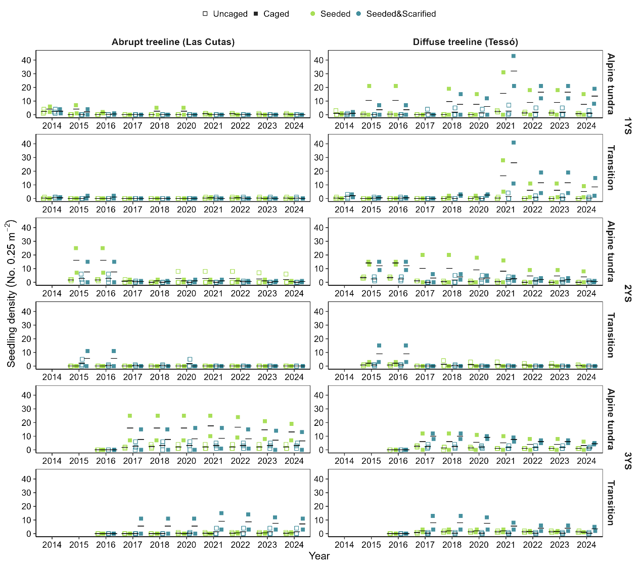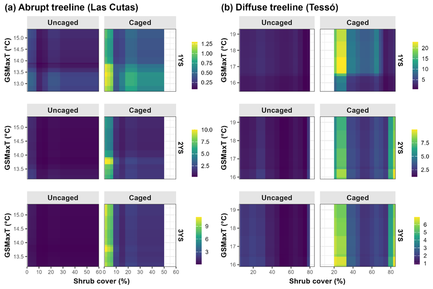研究表明,种子可用性是两类树线幼苗更新的共同初始限制因子(图2)。播种虽能促使幼苗大量萌发,但随后几年幼苗存活率快速下降,此模式在渐变型树线中更显著。网笼防护显著提高了幼苗密度,表明植食压力是关键生物限制因子(图3)。树线类型调节着生态过程的强度,渐变型树线对种子供给和植食压力表现出更高敏感性(图4)。灌木对幼苗的影响则具有双重性:灌木可以通过竞争限制幼苗生存,而在低温或风雪胁迫更强的环境中能通过改善微环境促进幼苗存活(图5)。此外,极端气候事件(特别是近年极端高温)导致新生幼苗的存活率大幅下降,表明气候变暖增加了幼苗在夏季高温与干旱条件下的死亡风险。