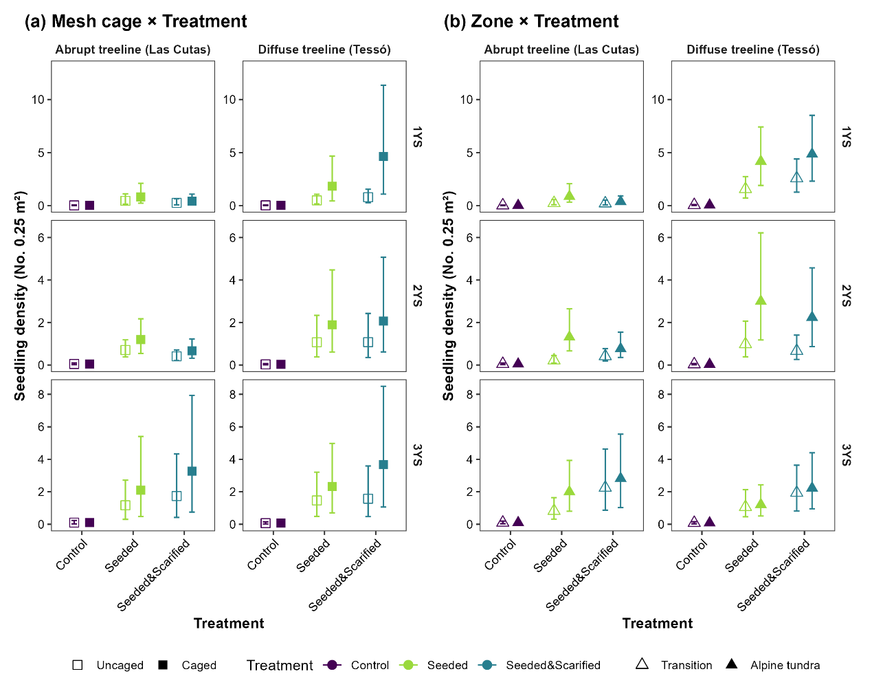 图3 两种树线类型的幼苗密度对(a)网笼×处理和(b)区域×处理交互作用的响应