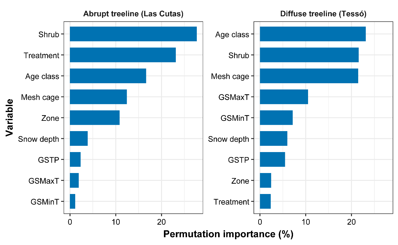 为揭示驱动树线动态的关键生态过程,中国科学院青藏高原研究所生态系统格局与过程团队梁尔源研究员与西班牙比利牛斯生态研究所J. Julio Camarero研究员选取比利牛斯山脉的欧洲山松(Pinus uncinata)突变型与渐变型树线作为研究对象(图1)。实验设计包含控制、播种、松土以及“播种+松土”四种处理,同时在部分播种样方中设置网笼以排除植食性动物。通过2013-2024年间的分批播种与持续监测,以此探究不同环境条件与生态因子对树线幼苗更新的相对影响。