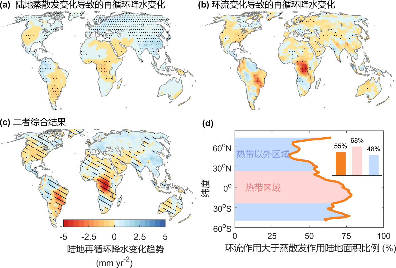 图1 陆地蒸散发和环流变化对再循环降水变化的贡献对比