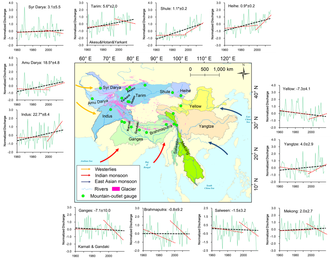 中国科学院青藏高原研究所环境变化与多圈层过程团队通过分析长时间序列的观测数据和水文模型模拟结果,发现青藏高原河流径流呈现明显的区域分化特征:西风带主导的河流(印度河、阿姆河、锡尔河、塔里木河、黑河、疏勒河)径流显著增加,季风区河流(恒河、雅鲁藏布江、澜沧江、怒江)的径流则呈不显著下降趋势,而过渡区河流(长江、黄河)径流变化相对平缓,分别呈现轻微增长和下降态势。值得关注的是,1997年后这种差异化趋势大幅加速:西风带主导河流的径流增长速率近乎翻倍,而季风主导河流则出现突发性锐减,转折点与1997/98年厄尔尼诺事件引发的全球大气环流调整密切相关。