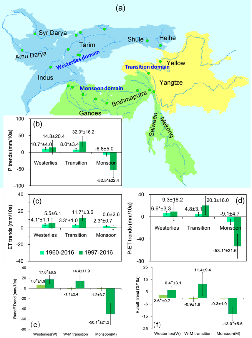 图2 1960-2016年和1997-2016年期间,青藏高原不同气候区山区流域(a)平均的年降水量(b)、蒸散发量(c)、降水与蒸散发差值(d)、径流(e-f)的变化趋势对比。“*”表示趋势显著(p < 0.05)。