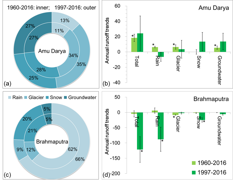 图3 阿姆河(西风带影响区)与雅鲁藏布江(印度季风影响区)出山口径流组分及其变化趋势(1960–2016年与1997–2016年)。a、b为阿姆河数据,c、d为雅鲁藏布江数据;a、c表示径流组分占比,b、d表示各组分的年际变化趋势。“*”表示趋势显著(p <0.05)。