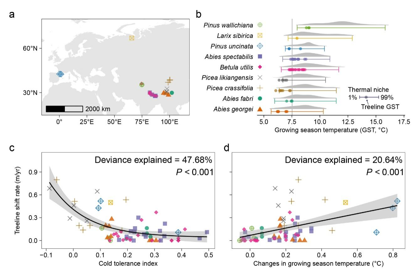 图1.冷耐受指数(CTI)比增温幅度能更好的解释树线迁移速率。(a)该地图展示了所有树线样点的分布情况(样本量:n = 66)。(b)以生长季平均温度(GST)表示每个物种的热生态位范围,以及树线样点GST在热生态位内的相对位置(彩色点)。线段表示物种热生态位宽度,其定义为物种全球分布记录中,所有点GST的第1和第99百分位数。灰色垂线表示所有树线样地的平均GST。(c)树线迁移速率随CTI指数下降(偏差解释度:47.68%,p<0.001),(d)随当地增温幅度线性上升(偏差解释度:20.64%,p<0.001)。阴影区域表示95% 置信区间。不同形状和不同颜色的点代表不同物种(参考图b的y轴)。