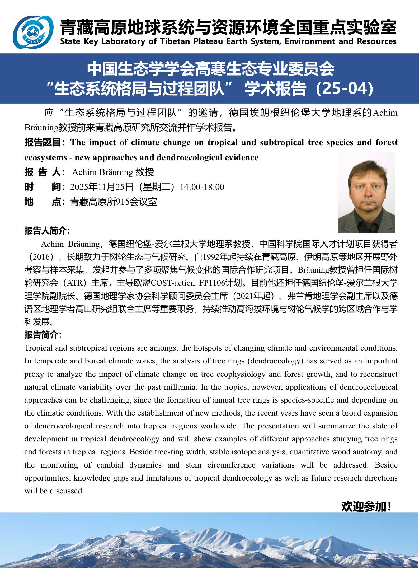 报告题目:The impact of climate change on tropical and subtropical tree species and forest ecosystems -new approaches and dendroecological evidence