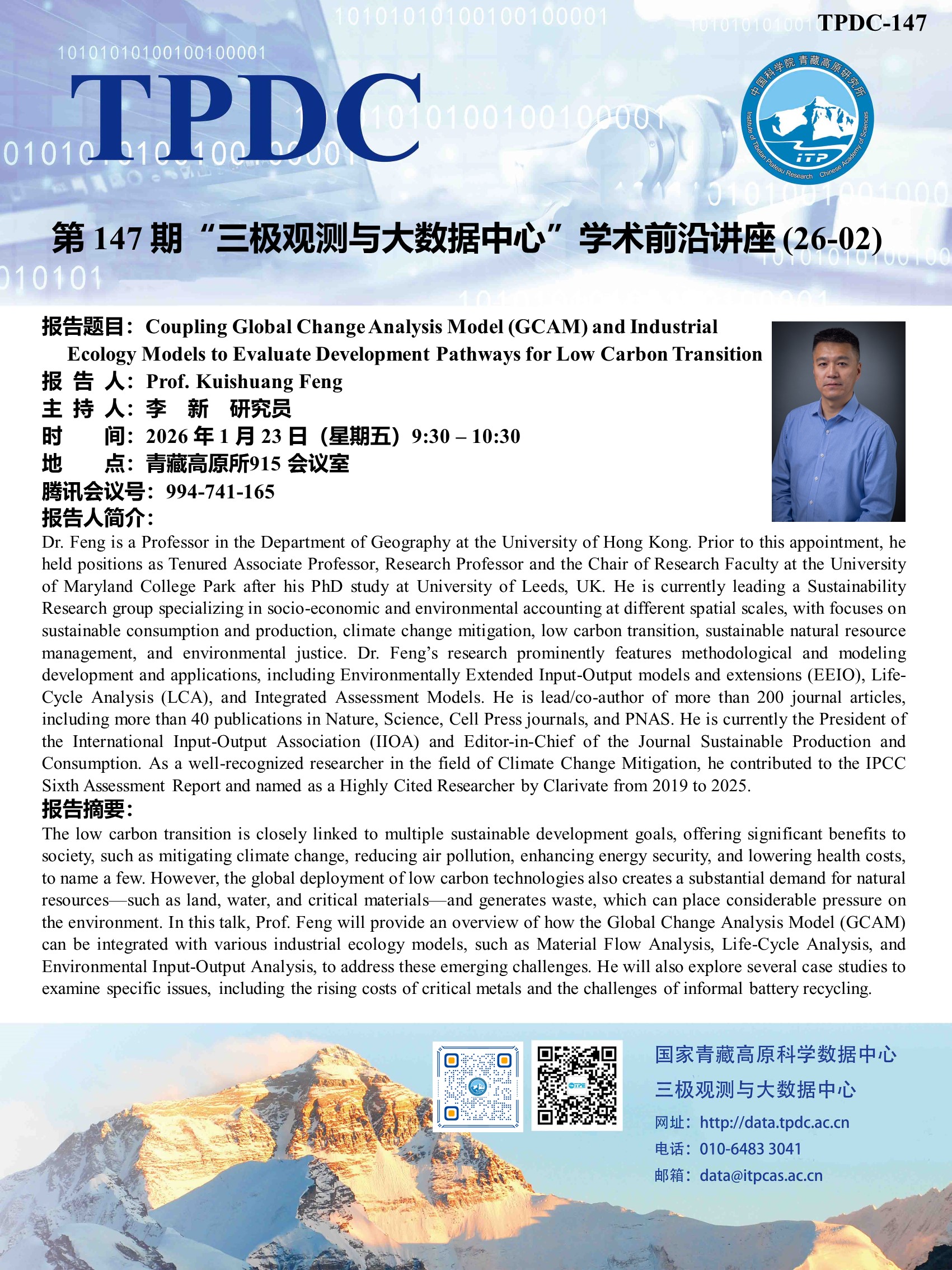 报告题目:Coupling Global Change Analysis Model(GCAM) and Industrial Ecology Models to Evaluate Development Pathways for Low Carbon Transition