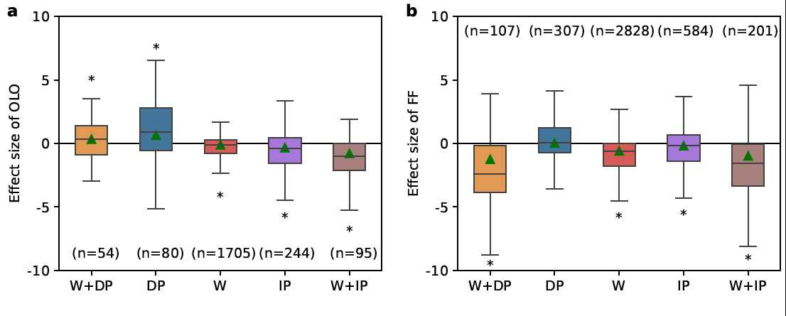 植物物候(如返青期和开花期)是生态系统响应气候变化的重要指标。随着全球气候变暖,植物春季物候普遍提前,但增温也可能引发土壤干旱等,从而推迟物候。尽管已有大量研究探讨了增温和降水变化及其互作效应对植物物候的影响,但目前尚未有一致的结论,特别是发现温度与降水变化对植物物候的影响存在协同、拮抗和没有互作效应。所以,我们假设这些差异可能源于不同试验地点的环境气候条件不同,尤其是干旱程度的差异(图1a)。特别是不同植物功能群植物(如禾草、莎草、杂类草和豆科植物)的抗旱性或耐旱性不同,它们对气候变化的响应也可能不同,进而导致不同植物物候对温度与降水变化及其互作效应表现出不同的响应模式。