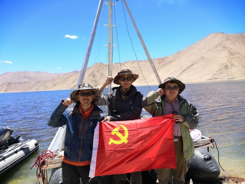 中午时分,科考队员在西藏阿里地区夏达错湖畔上湖作业前,科考队的青年党员重温入党誓词,回忆初心,激发爱国敬业正能量。