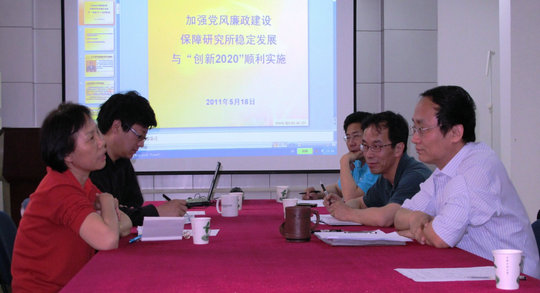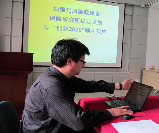 党委书记谢鹏云主持会议,他首先阐明了此次中心组扩大学习会的背景和目的,向与会同志介绍了党委中心组全年学习计划安排,并指出加强党风廉政建设不仅是我院的工作要求,也是研究所发展所需。他还就目前我所正在建设中的北京部科研大楼以及野外台站建设中遇到的一些问题,和与会人员探讨了如何建立符合我所科研特点的廉政长效机制,以更加透明、公开的方式接受所纪委和全体职工的监督。