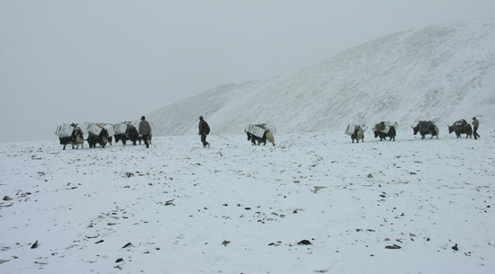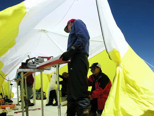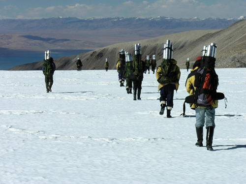 把钻取的420多米,4吨多重的冰芯运到冰川末端营地是一项最艰苦的工作。住在冰川末端营地的中方工作人员共15人全部出动,每天上冰川一次,每人背3支冰芯,每天要走6-8个小时。在由乱石堆里走路要特别小心,背着重重的冰芯很容易失去平衡而摔倒,也容易把脚扭伤。在大雪天里,石头上根本不能走,队员们就小心翼翼地走在光滑的冰川面上。最担心是不是伤到自己,而是担心自己摔倒后摔碎了冰芯。经过连续10天的艰苦工作,所有冰芯安全运到了冰川末端营地,并由牦牛运到了大本营的冷冻车上。
