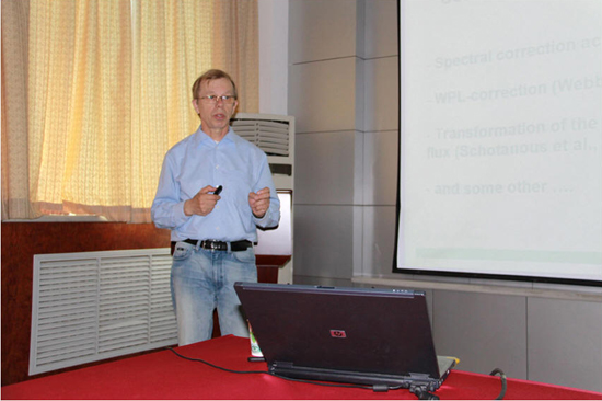 访问期间,德方Thomas Foken教授作了题为“The Eddy-Covariance Method - Possibilities and Limitations”的学术报告,对数据质量控制的重要性和控制方法、迹痕分析、地表能量观测不闭合等国际前沿问题作了精彩讲解,得到了与会者的好评。同时,中方青年学者也作了学术报告,Thomas Foken教授提出了中肯的指导意见。此后,双方大气物理研究的人员充分交换了意见,对双方的合作机制和取得的成果表示满意,并期望加强双方人员互访,在野外观测和合作研究上更进一步。本次访问也吸引了来自北京大学和北京师范大学的研究生前来参加。