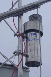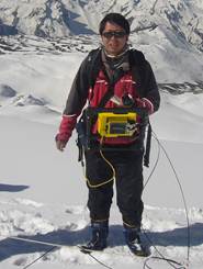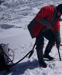 这次考察顺利的完成了以下主要观测及试验:Yala冰川物质平衡观测(图2);Yala冰川表面绝对高程和冰川边缘位置的差分GPS测量以及冰川表面高程变化的回放监测,完成了该冰川动态变化监测的重要一步(图3);Yala冰川厚度探地雷达GPR测量(图4);维护Kyanjin Gompa (3900 m)与Tarahara (119 m)两地的自动气象观测站,分别架设雨量桶,并下载气象数据(图5);沿途梯度架设持久性有机污染物(POPs)被动采样器(图6)。