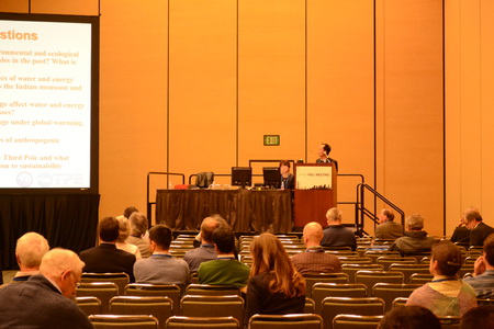 美国地球物理联合会(American Geophysical Union)秋季大会(AGU Fall Meeting)是地球物理科学领域最具影响力的大会之一。2013年12月9日至13日,2013年AGU秋季大会在旧金山举办,来自世界各地超过2万名科学家参与了大会,共同探讨地球物理科学领域的最新研究成果。在本次AGU秋季大会上,“第三极环境”(TPE)国际计划组织了主题为Environmental and Eco-system Changes in the Third Pole and other Mountain Regions的TPE专题分会。此次专题分会由TPE计划的姚檀栋院士、美国俄亥俄州立大学Lonnie G. Thompson教授、德国森肯堡科学研究中心Volker Mosbrugger教授、张凡研究员,并联合瑞士伯尔尼大学山地研究计划主任Gregory Greenwood以及美国内华达大学Franco Biondi共同主持,分会关注的地域扩展到了与第三极有着共同地理特征的其他高山地区,共同探讨这些地区所面临的生态与环境问题。 围绕全球变化背景下的第三极地区和其他高山地区的生态系统和环境变化这一研究主题,本次分会邀请了来自中国、美国、德国等知名研究机构的12位学者在TPE的两个专题分会现场作了口头报告。另外还有25位研究者在TPE分会的展板会场以展板形式与参会者分享了他们的研究成果。Lonnnie Thompson教授作为分会第一位报告人,作了题为“过去1000年喜玛拉雅和安第斯山冰芯记录的两例极端气候事件及对人类的影响(Two Extreme Climate Events of the Last 1000 Years Recorded in Himalayan and Andean Ice Cores)”的报告,吸引了众多感兴趣的科学家;姚檀栋院士题为“青藏高原与周边地区冰川变化及其与大气环流关系(Different glacier status with atmospheric circulations in Tibetan Plateau and surrounding regions)”的报告向与会者介绍了第三极地区冰川变化的最新研究成果。此外TPE计划邀请了三位著名科学家作了特邀报告。他们分别是德克萨斯大学的Rong Fu教授、佐治亚理工学院的Peter J Webster教授和俄亥俄州立大学的C. K Shum教授。他们的报告题目分别为:气候变化和污染对亚洲季风/青藏高原地区冰、气溶胶和水汽向对流层上部和平流层下部运输的影响(Influences of the climate changes and pollutants over the Asian Monsoon/ Tibetan Plateau region on transport of ice, aerosols and water vapor to the upper troposphere and lower stratosphere);第三极的动力学、热力学和水文影响(Dynamical, thermodynamical and hydrological effects of the Third Pole);通过GRACE重力测量估算当代亚洲高山冰川物质平衡(Contemporary Asian High Mountain Glacier Mass Balance Estimates from GRACE Gravimetry)。 在展板会场,以TPE计划为核心的TPE专题展板同样吸引了各国科学家的兴趣。围绕“第三极环境”这一主题,与会者展开了热烈讨论和深入交流。TPE计划的青年人才培训项目以及野外观测台站体系受到了极大关注,尤其吸引了发展中国家青年科学家的兴趣。他们表示,这是一个为各国尤其是发展中国家青年学者提供交流和学习的优秀平台。