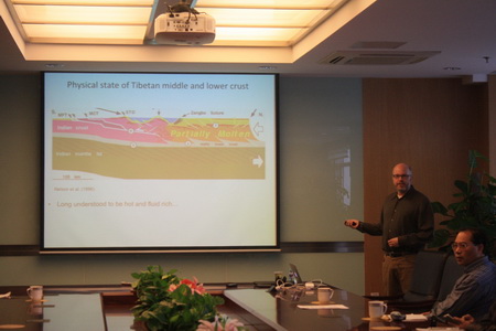 2014年2月20日,应大陆碰撞与高原隆升重点实验室、国家自然科学基金“青藏高原北部气候与构造相互作用”创新研究群体方小敏、颜茂都研究员邀请,美国俄勒冈州立大学Eric Kirby副教授访问我所并作题为“Probing the rheology of Tibetan crust: shoreline deformation around Siling Co in response to lake level fluctuations”的学术报告。方小敏研究员主持报告会,中国地震局地质研究所、中国地质大学(北京)和我所相关科研人员参加报告会。 Kirby博士在报告中深入浅出地阐述了当前青藏高原地壳流变研究的进展和问题,并着重介绍了其课题组在色林错湖开展的地壳变形研究,通过对色林错湖边系列由于湖水退却造成均衡调整形成的高古湖岸线的勘察,对比地质地貌特征,结合地震剖面资料,开展年代学和地壳形变量等方面研究的最新成果。报告会及到访期间,Eric Kirby博士还和大家就感兴趣的科学问题进行了深入交流讨论并参观了我所三个实验室。 Eric Kirby博士毕业于麻省理工大学,曾在加州大学圣巴巴拉分校做过博士后,在美国宾夕法尼亚州立大学地球科学系做过副教授,现任美国俄勒冈州立大学地球海洋和大气科学院主任,长期从事构造地貌、地表过程和地貌演化等方面的工作,在我国青藏高原中、东部尤其是龙门山地区开展了大量的研究工作,是构造和气候相互作用研究领域的杰出新秀,在国际舞台上相当活跃。