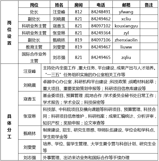 1. 科研:科研机构平台建设与管理;科技政策制定更新;科研项目的策划、组织申报管理;科研经费管理服务;科研成果的策划、奖励申报和统计分析;科研成果的激励等政策制定、年度亮点成果评审;专利、成果转移转化等知识产权管理;院地合作;学术委员会秘书处日常工作;学术会议的组织管理;实验室/台站建设管理;境外中心的建设管理等;负责卓越中心办公室日常事务、“一三五”办公室日常事务。