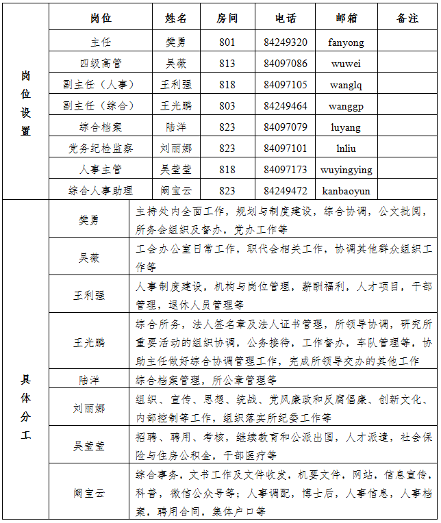 3. 人事:负责人才规划制定、人事制度完善、机构与编制管理;负责人员招聘、岗位聘用、绩效考核;负责人才引进、人才项目申报和干部选拔;负责薪酬福利、社会保险、住房公积金和干部医疗管理;负责职工继续教育与培训、公派留学管理;负责人事调配工作;负责干部人事档案管理;负责人事基础数据维护、人事信息统计与宣传等工作;负责博士后管理;负责人才派遣和项目聘用人员管理;负责户籍管理;负责住房改革工作;负责退休人员管理;完成所领导交办的其他工作。