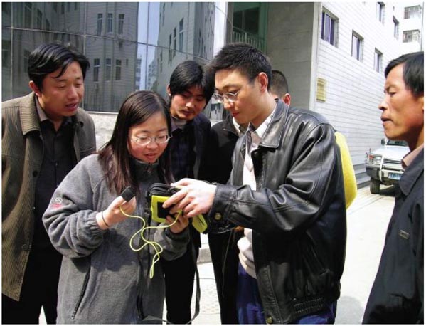 14: 00,准备装车,物资从井老师办吃}室搬了出来,一时楼道里和门厅里被 堆得满满的,大到贵重的科研设备,小到土豆、胡萝卡。这是我们40多人的科考大家庭在以后3个月的科考仪器、生活物资啊!垒在院中比珠峰低不了多少。装车前,康老师抓紧时间教我们用"测氧仪"一一一个很小巧的医学仪器,让王小萍老师在以后每天早饭时给大家测血液含氧量和心率,并要记录,时刻关注每一个队员的身体。