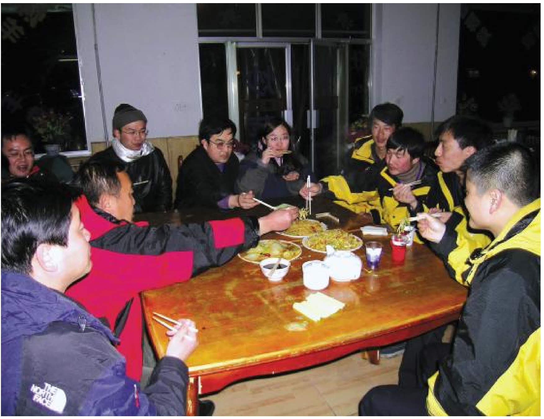 天一点点黑下来,雪停了。但随着温度的降低,路面上的冰也越来越多,司机一言不发,全神贯注地注意着路况。晚上8点我们到达一个叫天峻的小镇。井哲帆老师跟我们说,前面还有一座山,现在情况还好,再过一个小时,翻过去后到茶卡再休息。颠簸的路面使大家很辛苦,肚子也饿了,车子在有小卖部的地方稍停后,大家买了一些花卷,先垫一些。短暂的停顿之后,我们又继续行进,也许老青藏们都已习惯了这种情况,看他们都非常镇静并自然地应对着这一切,我很羡慕。
