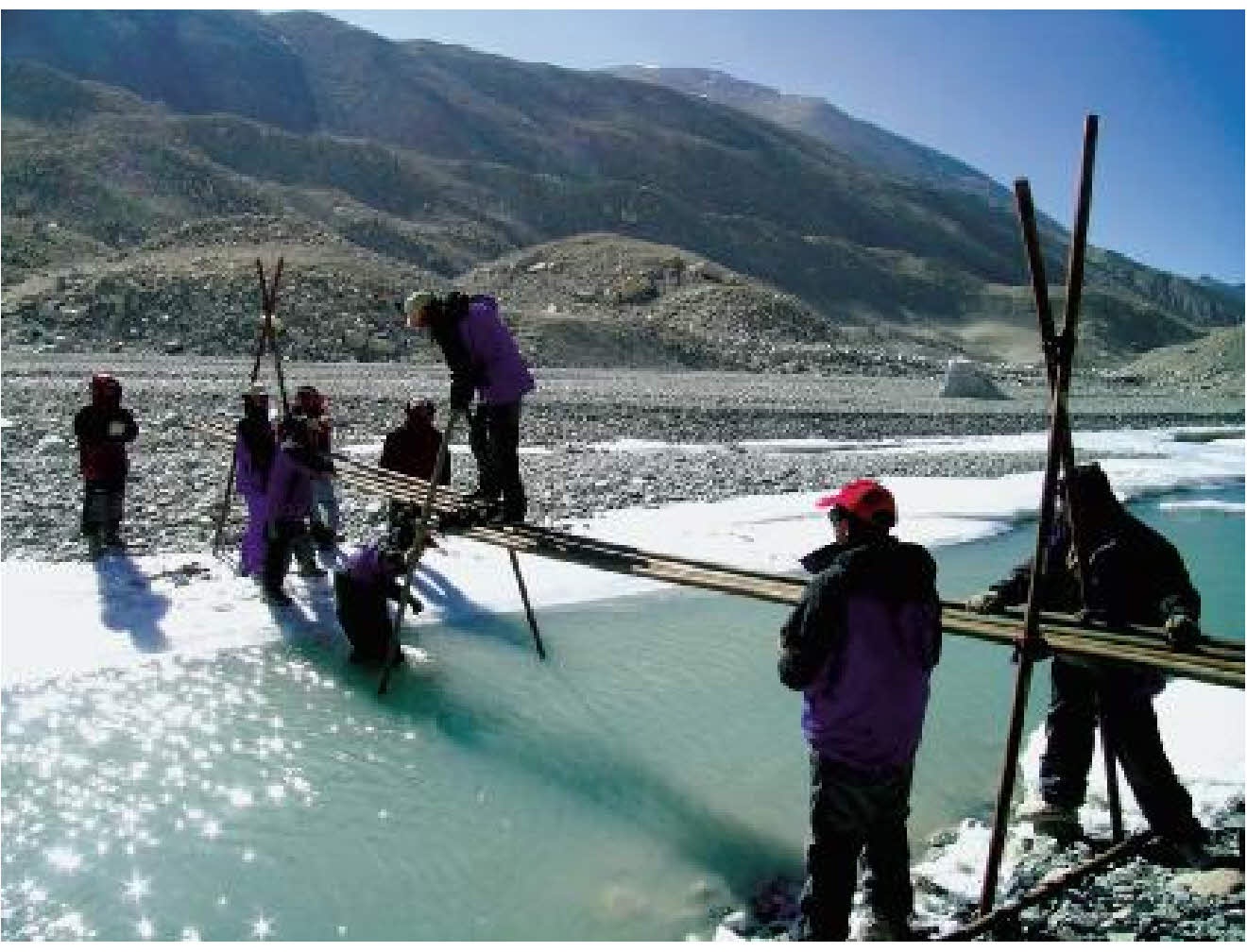 下午吃完饭大家分头忙碌,一部分人卸车,一部分人搭帐篷,冰川组的刘景时老师和秦翔老师带领一部分人去大本营附近的绒布河架设水文观测站。我跟过去,最初的想法是想了解如何架设水文剖面的知识,但今天下午,我所看到的和学到的,却不仅是水文剖面的知识,我看到的是我们科学家如何"能文能武",我们的科学家不仅能坐下来写文章更能在野外极端环境下创造科研条件,真是"遇山开路,遇水修桥"。两个老师带着大家把10多根钢管和一个大铁桶抬上大车,开着大车一路颠到河边。随后麻利地把东西卸下来,刘老师和秦老师各拿铲、锹开始工作起来。设水文断面需要对河床状况进行调查,这一工作刘老师早在前几天就做了,最后选定这个点,此处河床不太宽,高水位时也不会受影响。为了测水文断面,必须在河面上架起一个桥,然后可以在上面用仪器测断面的流速。在旁边还要安装一个大铁桶,里面放置仪器来不间断地测水位,两个方面结合确定流量。今天下午就是要架桥。老师们笑着说这是"珠峰第一桥",用6米长的钢管八根,接成12米长的桥梁,桥梁高出水位1米。在建桥时,科学家们充分利用了"各自的智慧和点子",先把两段用接口接好,然后从河的一边架过,另一边用绳子拉过,再两边架高,中间由人站在河中再度架高。4月,河水透骨的冷,但技工杨伟伟什么也没说,穿上水裤就下水了,站在冰冷的水中把中间的架子架好。刘老师和秦老师两个科学家在大风中抬着钢管趟着水,完全找不到文弱书生的样子。风越来越大忙忙碌碌地架好桥,接着又在河边挖平一块,把大铁桶放好,以备下一步安装测流量的仪器。整整一个下午就这么快速地过去了,"珠峰第一桥"架起来了,大家的嘴唇也被吹得干干的了,在风中大多数人也"泪眼汪汪"的,但看着可爱的成果,大家都笑呵呵地往回走。这只是水文观测的第一步,以后长期的观测将更是艰苦和持久的工作。