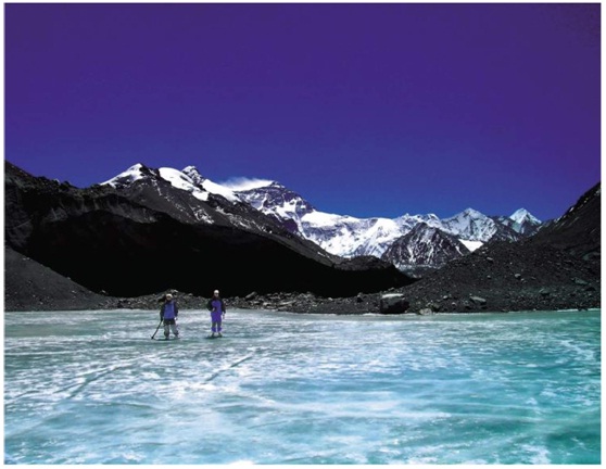 我跟着刘老师和康老师去测冰湖,也想尝试着采一些冰湖的冰样以做微生物测试。刘老师在这几天的实地考察中发现大量冰湖的存在,回来和康老师讨论后,他们认为有必要进行一些实地水量测量,因为这些湖可能在将来形成大的冰愤湖,并可能对珠峰地区的生态和环境造成一定影响。走前刘老师就告诉我路会很难走,要下到60米的沟里,虽然有思想准备,但路的难走状况也还是令我的腿到现在还酸痛不已。我们在两种极端的路上行进,一会儿是不停地在毫无路可言的石堆上跳来跳去,一会儿是在滑得不行的冰湖面上"履冰"。刘老师和康老师游刃有余地在前面走着,我努力地在后面战战兢兢地跟着。翻过了几个侧陆后,我们到达了第一个冰湖,先在冰湖的湖边,把冰面碰开,把尺子探入水中以测量冰湖的水深和表层冰厚,然后再到冰湖的中间,破冰,丈量,记录,进行一系列的工作。冰湖面上的风很大很大,冰也很厚,有时一铺下去只能砸一个小白坑。康老师、刘老师和协助工小王互相换着,在砸开一个小坑以后,还要下子把碎冰捞出,一会儿他们的子就成"红萝卡"了。第一个冰湖测完了,叉开始向第二个湖出发,有时冰不够厚,走着走着,"卡卡"地出现冰裂声,康老师立即让大家别动,自己卧倒在冰面上,惊险不断,但大家继续坚持着,一直到测完三个大湖的水深。