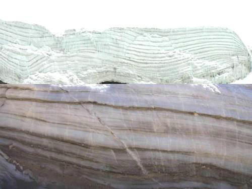 冰芯,顾名思义,就是钻取自冰川内部的芯。冰芯形成由于气温低,积雪不融化,每年的积雪形成一层层沉积物,年复一年,从底部往上逐渐形成一层层的冰层,越向上年代越新。冬季气温低,雪粒细而紧密;夏季气温高,雪粒粗而疏松;因而,冬夏季积雪形成的冰层之间具有显著的层理结构差异,宛如树木的年轮一样。
