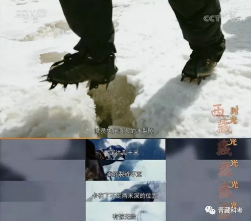 在搬运物资过程中,10位藏族队员在下撤时无意用手机拍到一位队员不慎跌入冰裂缝中,幸好裂缝不宽,有惊无险。