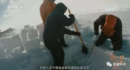 山顶上经常刮起10级大风,科研人员不停地垒砌雪墙阻挡暴风雪。