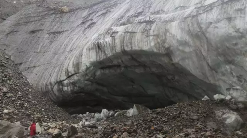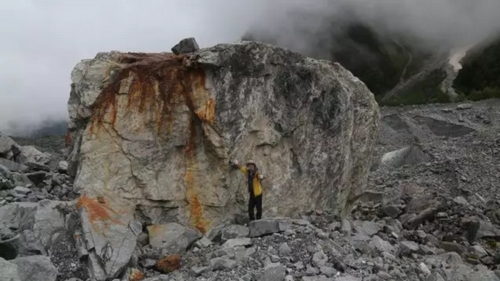 在米堆冰川这里露出的基岩犹如骷髅面具,两个黑眼眶看着人们,张着嘴巴好像想说点儿什么,关于气候变暖对它的影响。