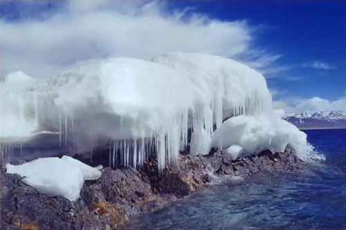 纳木错春季消融时岸边出现的冰雕奇观