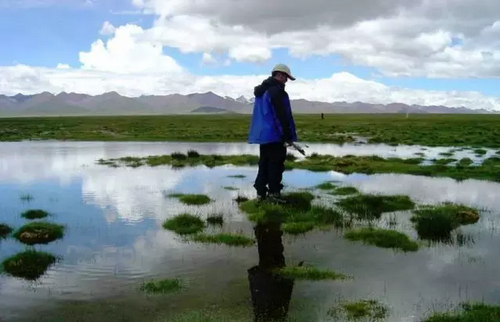 科研人员在藏嵩草占优势的沼泽地调查、取样