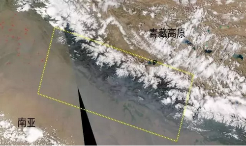 美国航空航天局卫星观测到的2017年5月7日火燃烧烟尘气溶胶向青藏高原地区传输(黄框内灰色部分为烟尘气溶胶),影像来自于网站:https://worldview.earthdata.nasa.gov/