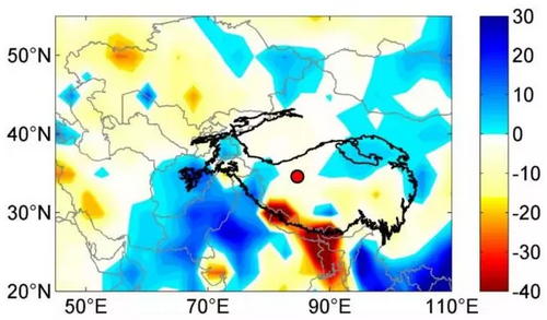 青藏高原及周边地区2000年至2012年的降水变化情况(红色表示减少,蓝色表示增加)