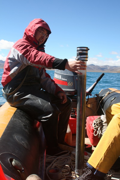 (5)纳木错中东部湖区表层沉积物采集及水质测量:为进一步了解纳木错现代湖泊沉积过程,本次考察在纳木错中东部大范围的湖区内利用抓斗采样器进行表层沉积物的采集,共获取表层沉积物42个,这些采样点基本上呈网格状分布,采样点水深从7m到97m不等。利用Hydralab DS5型多参数水质监测仪测量湖水剖面3个。至此,共已获取纳木错表层沉积物67个,水质测量共18个剖面,覆盖了整个湖泊,对纳木错沉积物空间分布规律及差异等研究提供了良好的研究基础。