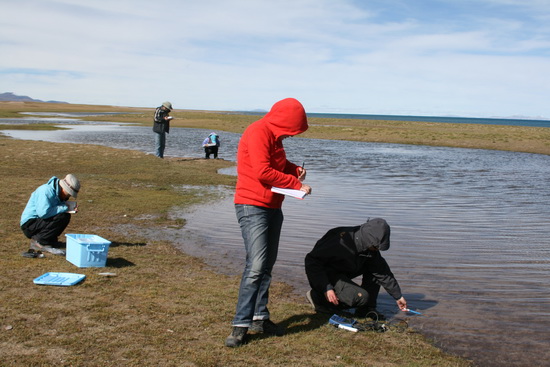 (3)沉积物及水体中介形类样品采集:为了建立介形类组合与环境要素的转换函数,本次考察沿青藏公路线、普莫雍错湖区、羊卓雍错湖区及纳木错湖区进行了细致的现代介形类及水样的采集,并对介形虫的生活环境(水体电导率、pH值、温度、氧含量)进行了测量及描述。采得水样、沉积物样各70余个,并对部分样品进行现场处理,分离出活体介形虫,用于分类工作。