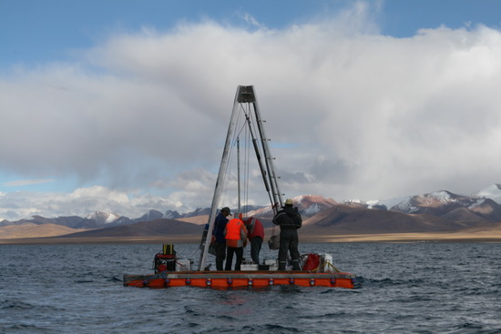 在水上平台利用活塞取样器进行长岩芯钻取-纳木错 |
