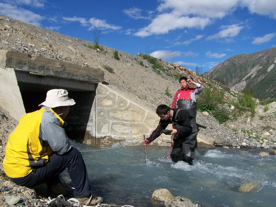 (3)河流样品采集:为了完善湖泊的整体水化学研究,对然乌湖入湖河流进行了样品采集、水质多参数和流速的测定。共取得河流水样15个,并利用多参数水质仪对河水进行了水温、pH值、电导率、溶解氧等的测定。同时利用流速仪对10条入湖河流进行了简易的流速测定。