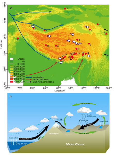 最近,地学领域最具影响力期刊之一Reviews of Geophysics (IF=13.906) 发表了我所姚檀栋研究员(第一作者)、高晶副研究员(通讯作者)与其他10多名作者共同撰写的文章。文章通过青藏高原降水稳定同位素揭示了印度季风与西风相互作用的三种模态。 中科院青藏高原研究所研究人员多年来在青藏高原降水稳定同位素的观测中获得的结果和高精度稳定同位素大气环流模型模拟分析相结合,发现印度季风和西风对青藏高原降水中稳定同位素有决定性影响,在空间和时间上以三种模态表现出来,即印度季风模态、西风模态和过渡模态(图1)。印度季风模态表现为降水氧稳定同位素在春季达到最高值,自5月开始迅速减小,8月达到最低值。西风模态表现为降水氧稳定同位素与气温和降水量具有相同的季节变化模式,即夏季高值,冬季低值,其降水氧稳定同位素与气温有显著正相关。过渡模态表现为降水氧稳定同位素没有明显的冬季或者夏季的极值,其与气温和降水量的关系也较其他两个区域复杂。研究发现,当西风区和季风区受单一主导大气过程控制时,温度效应更显著。 这一研究是建立在大数据挖掘基础之上的。研究通过对青藏高原24个站点(19个TNIP站点和5个GNIP站点,图2)长于10年的观测降水氧稳定同位素分析,建立了一个目前最完整的青藏高原降水氧稳定同位素数据库。利用这一数据库研究了降水氧稳定同位素的时空分布模式和其与气温、降水量的相关性,从而将青藏高原降水氧稳定同位素分为三个不同的模态,同时,结合大气环流分析,发现西风和印度季风的相互作用是青藏高原降水氧稳定同位素三种模态的核心驱动力。 这一研究是以现代isoGCMs模拟手段的运用为提升手段的。研究将24个站点观测数据结合三个目前精度最高的同位素GCM模型(LMDZiso,ECHAM5-wiso和REMOiso)的模拟结果,及同时期气象数据(气温、降水量和风场)分析,评估了青藏高原降水氧稳定同位素的气候控制因素,分析了温度效应、降水量效应和海拔效应在不同区域的差异。本研究还首次提出水汽来源自孟加拉湾向南印度洋的转变导致了青藏高原东南部季风期降水δ18O的两次显著减小。 这一研究结果对于古气候氧稳定同位素记录的解释和古气候、古海拔高度模型模拟都有重要意义。