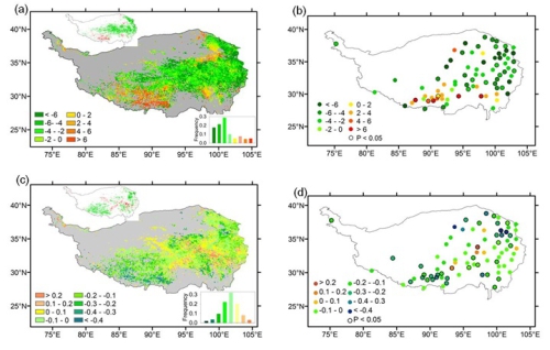 图1 (a, b) 返青期对冬季温度年际变化敏感性(day/oC)的空间特征,分别基于格点气象资料和气象站观测资料计算;(c, d)返青期对冬季温度年际变化敏感性(day/mm)的空间特征。 |