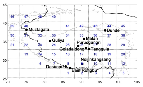 图1. 青藏高原10根冰芯位置和LMDZiso模拟结果网格分布