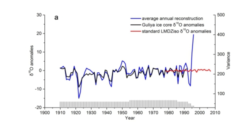 图2. 1910年以来青藏高原年降水稳定氧同位素重建序列与LMDZiso模拟结果和古里雅冰芯稳定氧同位素距平对比 |