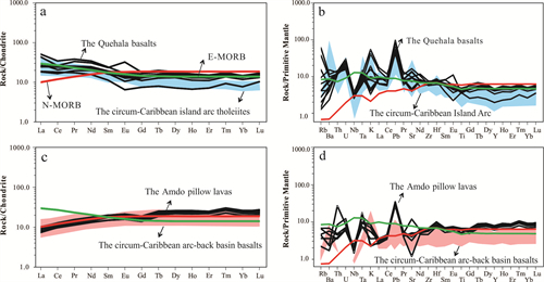 图2 安多地区晚三叠世火山岩稀土元素球粒标准化和不相容元素原始地幔标准化图