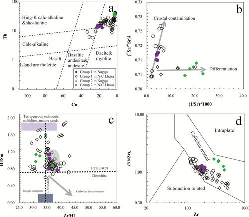 图4 拉萨中北部早白垩世火山岩岩浆组分、源区及分异过程判别图解