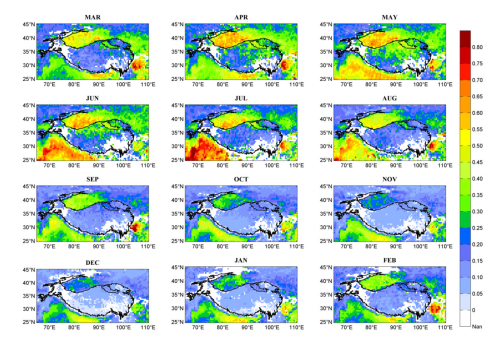 图1. 青藏高原气溶胶光学厚度的月变化特征