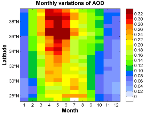 图2. 青藏高原气溶胶纬向平均月变化特征 这一研究成果发表在Atmospheric Chemistry and Physics (Xu, C., Ma, Y. M., You, C., and Zhu, Z. K.: The regional distribution characteristics of aerosol optical depth over the Tibetan Plateau, Atmos. Chem. Phys., 15, 12065-12078, 10.5194/acp-15-12065-2015, 2015.) 论文链接:http://www.atmos-chem-phys.net/15/12065/2015/acp-15-12065-2015.html |